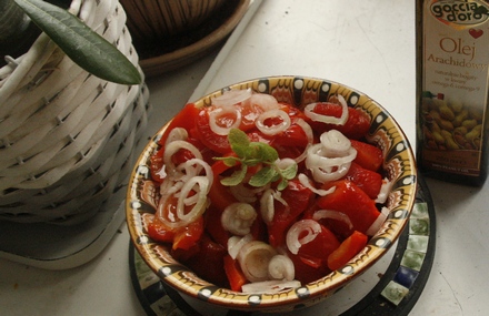 Jeszcze ciepłe papryki, po lekkim przestudzeniu, obrać ze spalonej skórki (można włożyć na chwilę do plastikowej torebki, co ułatwi oczyszczenie). Miąższ bez skórki pokroić w paski, a szalotkę lub cebulkę w plasterki. Wymieszać z listkami mięty, olejem, solą. Z wierzchu posypać pieprzem z młynka.