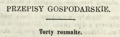 Bij w jedną stronę 12 żółtek przez godzinę, dodawszy pół funta cukru [funt to niecałe pół kilo] i skórkę z jednej cytryny otartą na tarce; przydaj w miarę najpjękniejszej mąki pszennej lub kartoflanej i pianę z 6 białek ostrożnie wmieszaj; miej formę masłem dobrze wysmarowaną i bułką wysypaną, wléj w nią massę, piecz w nie zbyt gorącym piecu przez 3 kwadranse: wyjąwszy z pieca, daj tortowi przestygnąć, wyjmij go, ulukruj, ubierz konfiturami, wstaw na chwilę w piec dla obsuszenia.