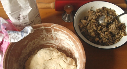 Ciasto cienko rozwałkować, podsypując mąką. Na ciasto nakładać farsz, wykrawać pierożki, zalepiać starannie. Farsz musi być zimny i nie może być go za dużo, bo pierogi się nie skleją. Odkładać na deskę posypaną mąką, przykryć ściereczką.