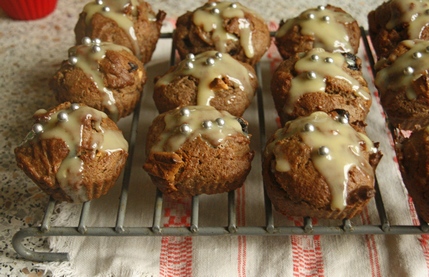 Z drugiej połówki czekolady i śmietany sporządzić lukier: na parze lub w mikrofalówce. Babeczki polukrować i udekorować.