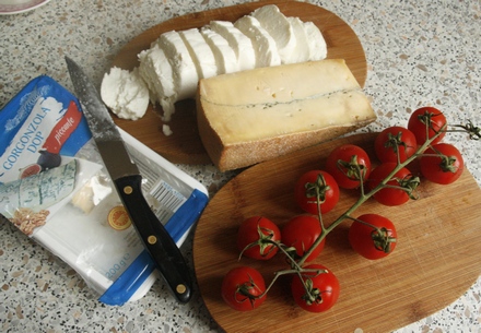 Proponuję wypiek typu francuska tarta. Nadaje się do wypełnienia rozmaitymi dodatkami. Oprócz ciasta na tartę musimy mieć jeszcze jakieś sery i pomidory, najlepiej małe, tzw. koktajlowe. Sery – mogą być oczywiście już napoczęte, a więc zużyjemy resztki – miałam trzy, z trzech porządków. Proponuję: z przerostem pleśni typu bleu – u mnie gorgonzola, twardy lub półtwardy, tzw. żółty – u mnie morbier, a wreszcie miękka i delikatna w smaku mozzarella. Sery można dostosować do stanu spiżarni. Ale niech się różnią smakami, konsystencją i wyglądem. Wzbogacą naszą tartę. A przyrządzimy ją w nieco ponad dziesięć minut, tyle trwa krojenie sera i wstępne podpieczenie ciasta. Będzie się piekło 20–30 minut. Zdążymy podać aperitif i z gościem się nagadać. A może i przygotujemy deser? Zdążymy!