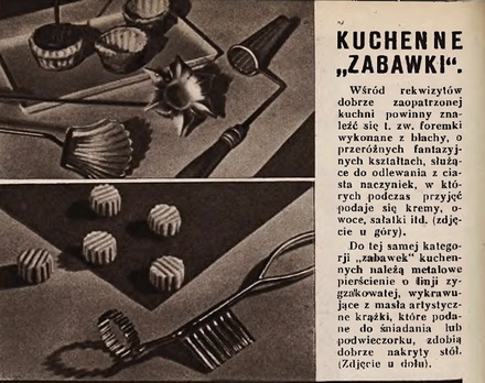 Takie muffiny wypiekamy w foremkach na babeczki – bywają okrągłe lub rowkowane. Dla mnie błogosławieństwem są foremki silikonowe. Nie trzeba ich dodatkowo przygotowywać do pieczenia. Ale mam w domu także foremki blaszane i szklane, bo tylko takie istniały jeszcze do niedawna. Mam także stare foremki z mojego domu rodzinnego. Nie wyrzucam ich, bo mam do nich wiele sentymentu. Na płaskiej blasze pyszne ciasta z kruszonką piekła moja Babcia, w wysmukłej keksówce babkę, którą nazywałam „puchatą”, piekła moja Mama. Szanujmy wspomnienia. Przekazujmy je dzieciom i wnukom. Czy znajdą u siebie miejsce na te stare przedmioty? Na przykład takie, jakie pokazał magazyn ilustrowany „As” w roku 1935.
