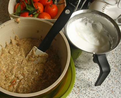Do masy z mandarynkami wmieszać jedną trzecią piany. Dobrze wymieszać, a następnie dołożyć resztę. Delikatnie wymieszać. Wyłożyć do foremki (blaszaną czy szklaną trzeba przygotować jak zwykle).