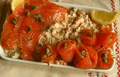 Odnotujmy pojawienie się alkoholu na stole, wszak postnym. W niektórych domach to pozostało do dziś. Menu nieco się zmieniło. W porównaniu z rokiem 1843 (przeszło sto siedemdziesiąt lat temu; ile to pokoleń przodków!) ryb u nas dostatek. Wybierać, przebierać. A może zamiast tradycyjnego karpia (u mnie będzie, jak zwykle faszerowany po żydowsku) na skromnym stole postawić po prostu wędzonego łososia? To znakomite rozwiązanie dla tych, którzy nie smażą ryb, nie lubią ryb, nie mają czasu na ich sprawianie. Byle kupić łososia z wędzenia na zimno, nie najtańszego. Ponieważ kroi się go w cienkie plasterki, starczy na wiele porcji. Podajmy go na tradycyjnej sałatce jarzynowej, przybierzmy kaparami, a na pewno wiele osób po niego sięgnie.