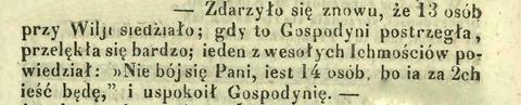 I w rzeczy samej, są to rozczulaiące biesiady. Zwykle zgromadza się cała Rodzina, Przyiaciele, Domownicy, Czeladka. Stół bywa liczny, ochoczy. Nieodrodna od poprzedniczek swoich wilji zeszło Sobotnia, obchodzoną była w Warszawie z serdeczną, przyiacielską uroczystością. Przed stołem łamano opłatki, z rodziną, dobremi przyiaciołmi i słażącemi; winszowano sobie, doczekania znowu tak solennego święta Religji, życzono Dosiego roku.