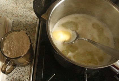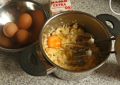 Wodę zagotować z masłem. Trzymając na ogniu dokładnie rozcierać z mąką, aż się otrzyma błyszczące jednolite ciasto. Przestudzić.