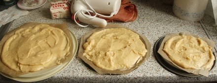 Ciasto rozsmarowałam w trzy zmniejszające się płaskie okręgi. Jak blaty tortu. Przełożyłam je – mało ambitnie, wiem, wiem – gotowym kremem do karpatki, tzn. tym z torebki, w proszku. Taki można kupić, szkoda że nie ma jeszcze naprawdę gotowych kremów w pojemnikach. Ten nasz „gotowy” trzeba ucierać…