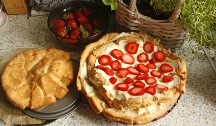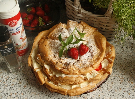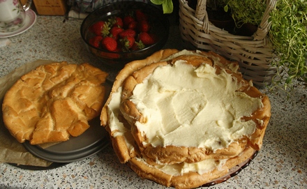 Trzeba tylko upiec trzy blaty z ciasta parzonego, czyli ptysiowego. Potem przekłada się je kremem, jak na karpatkę, oraz świeżymi owocami: truskawkami albo malinami. Można je kupić! Na ciasto podaję najprostszy i chyba klasyczną recepturę z mojego zeszytu z przepisami prowadzonego od lat… trzydziestu.