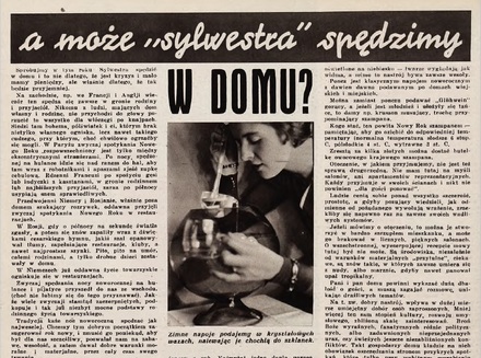 W ubiegłym roku przytoczyłam zabawną gazetową ciekawostkę z roku 1826 o historii warszawskiego Sylwestra. Kto ciekawy – ją znajdzie. Dzisiaj sięgnę nieco bliżej, bo do roku 1935. Krakowskie tygodnik „As” poddał wtedy myśl wówczas nową: A może Sylwestra spędzimy w domu? Poczytajmy! Wtedy nowość, w latach 60. zabawy domowe nazywane „prywatkami”, a dzisiaj „domówkami” stały się normą. I wyborem większości z nas. Tekst zawiera praktyczne uwagi, przydatne i dzisiaj. Nie tylko o temperaturze szampana, o tym, co podamy na kolację, ale i o dobieraniu gości nie różniących się poglądami. Pisownia przedwojenna – od naszej różni ją zwłaszcza pisanie wyrazów łącznie i rozłącznie. Jeszcze coś, co nas różni od przedwojennego towarzystwa: brak służby. Barszczyk i kanapki wnosimy sami, my, gospodarze przyjęcia. Dbamy też o czyste talerzyki i… pełne kieliszki gości. Zresztą i wtedy nie każdy zatrudniał służbę. Tyle że pisemko było nieco snobistyczne i udawało, że czytają je wyłącznie wyższe sfery.