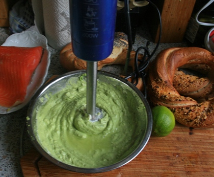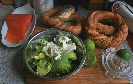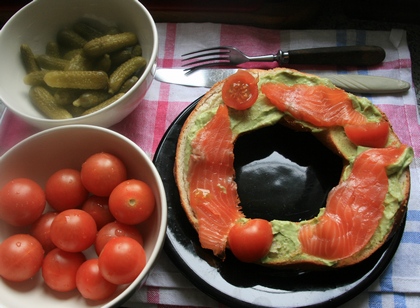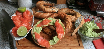 Wróćmy do bajgli. Podaje się je na modne od lat nowojorskie śniadanie. Żydowskie obwarzanki zrobiły więc karierę światową. Postanowiłam je połączyć klasycznie: z łososiem. Nie kupujmy najtańszego. Musi być smaczny i zdrowy. Zwykle do tego zestawu wchodzi biały twarożek. A mój był zielony. Bo z dodatkiem awokado.