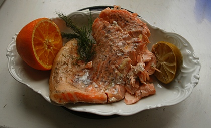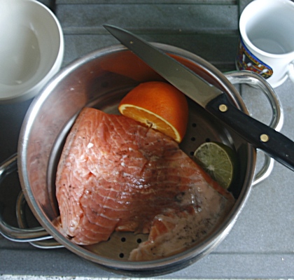 Łososia oczyścić z łusek (jeżeli jest ze skórą) i resztek ości. W garnku do gotowania na parze zagotować wodę. Posoloną rybę ułożyć w części z dziurkami, obok dać pomarańczę i limonkę. Przykryć. Gotować 8–10 minut. Delikatnie wyłożyć na półmisek, posypać koperkiem, z umiarem skropić sokiem wyciśniętym z ugotowanych obok cytrusów. Na wierzchu położyć kawałek świeżego masła. Popieprzyć.