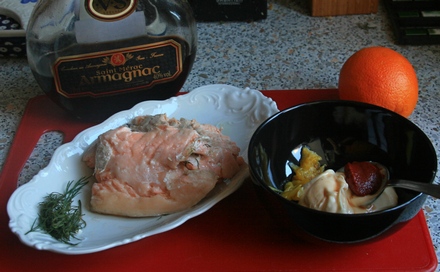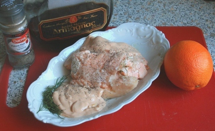 Majonez rozetrzeć z łyżką lub dwiema alkoholu, przecierem pomidorowym, sokiem wyciśniętym z pomarańczy tak, aby nie był zbyt rzadki, a na pewno nie wodnisty. Przybrać nim łososia, resztę podać oddzielnie. Ozdobić koperkiem, posypać dość obficie pieprzem z papryką lub tylko pieprzem. Podawać po schłodzeniu (w lodówce przykryć folią).