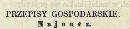 Czym była potrawa zwana „majonez” (w menu występująca jako „Majonez z drobiu” lub „z ryb”) dowiemy się z obszernego przepisu, który zamieściło warszawskie „Kółko Domowe” w roku 1866. Na początek powiem jedno: to nie jest majonez, jaki my znamy. Przytaczam w pisowni oryginału, z błędem.