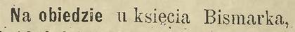 z obecnością cesarza Wilhelma i wielu dygnitarzy państwa, oprócz samej księżnej, honory domu czyniła młodsza jej synowa, hrabina Wilhelmowa Bismarkowa, która dnia tego przybyła z Hanoweru do Berlina, wraz ze swym małżonkiem. Menu, spisane na karcie litografowanej i przyozdobione u góry herbem rodzinnym Bismarków, opiewało: