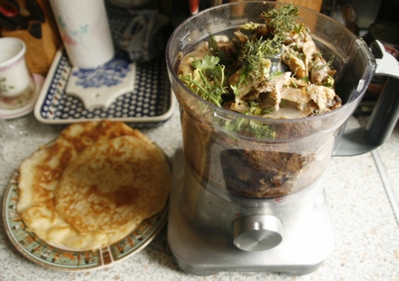 A oddzielone kawałki drobiu zawsze można odsmażyć czy odgrzać na kolejny obiad. Choć nie będą już takie smaczne. Za to nudne. Zmielone mogą posłużyć do wykonania zupełnie innego dania obiadowego. Lubianego, oryginalnego, o zupełnie innym charakterze niż pieczony drób (i odgrzany). Najprostsze będzie przygotowanie takiego zmielonego farszu i nadzianie nim naleśników. Chyba każdy potrafi je usmażyć. A jeżeli nie – niech kupi gotowe. Zawinięte wokół farszu i odsmażone staną się lubianymi gorącymi pasztecikami (krokiecikami), najczęściej dodawanymi do czerwonego czystego barszczu. Zamiast barszczu można przyrządzić bulion (nawet z kostki przy wielkim pośpiechu), rosół, czy inne czyste zupy – na przykład grzybową czy ogórkową. Ale i do szczawiowej, troszkę zapomnianej i niemodnej, będą oryginalnym i fantastycznie smakującym dodatkiem. Warto spróbować podać je na obiad lub wstęp do obiadu, zależnie od apetytu i…wymogów naszej wagi.