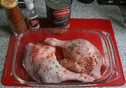 Wymyśliłam połączenie kaczki z włoską brązową fasolką borlotti. Jej puszka stała u mnie już smętnie i czekała na swój czas. I się doczekała. Połączyłam ją ponadto z włoskim przecierem pomidorowym. Czy powstało danie włoskie? No, powiedzmy, że we włoskim stylu. Całość doprawiłam gotową przyprawą nazywającą się karaibską. Składa się z nasion kolendry, cebuli w płatkach, soli i cukru. Śmiało można ją skomponować samemu. Warto pamiętać, że każde nasiona nieco uprażone na suchej patelni rozwiną pełną moc smaku.
