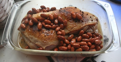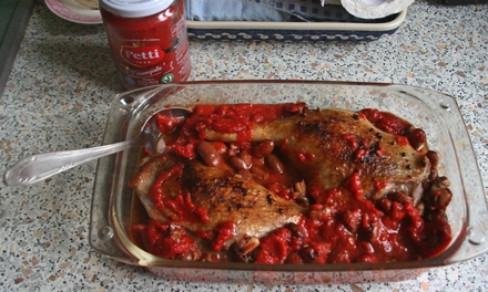 Mięknące udka podlać wywarem z odcedzonej fasolki. Wstawić na kwadrans do piekarnika. Następnie obłożyć fasolką. Dopiec kolejne 15–20 minut, gdyby pozostały twarde, przykryć je przykrywką lub folią aluminiową i poddusić. Na ostatnie 10 minut dołożyć przecier pomidorowy, wymieszać z fasolką.