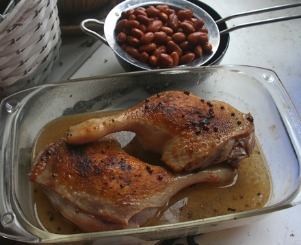 Zamiast piec, udka można udusić. Czyli po obsmażeniu przełożyć do rondelka, podlać wodą, a następnie wywarem z fasolki. Potem dusić z fasolą i przecierem pomidorowym. Udka pozostaną miękkie, co będzie zależało tylko od czasu ich duszenia. Tak więc nawet antytalent kuchenny zasłuży na pochwałę. Zwłaszcza że powstanie potrawa prawdziwie smaczna. Podajemy ją z ryżem lub pieczywem. W ostateczności z ziemniakami. Sałatę lub jakąś sałatkę warto podać jako appetizer wcześniej. A po kaczce? Proponuję jako deser sałatkę owocową. Zimową, najprostszą.