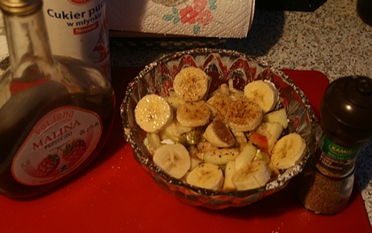 Banana bez skórki pokroić w plasterki, jabłko i gruszkę w paseczki. Tych owoców można nie obierać. Ułożyć na spodzie salaterki połowę plasterków banana, na to dać połowę paseczków jabłka, wszystkie gruszki, potem znów jabłko i plasterki banana. Skropić likierem, posypać cukrem pudrem i przyprawą korzenną. Schłodzić.
