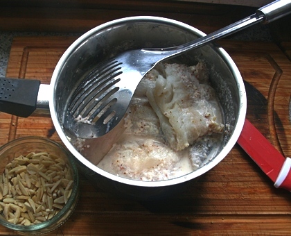 Filety dorsza po usunięciu ości i obcięciu płetw lekko posolić. Mleko wymieszać z mielonymi migdałami, zagotować, włożyć filety. Gotować 10–15 minut.