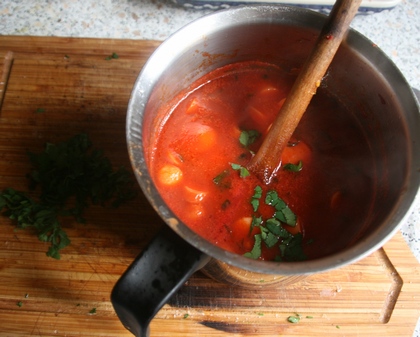 Sos poddusić 20–30 minut. Wrzucić posiekaną natkę (trochę jeszcze zostawić) i parówki pokrojone w cienkie plasterki. Trzymać na ogniu jeszcze kilka minut, aby parówki się ugotowały.