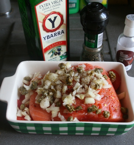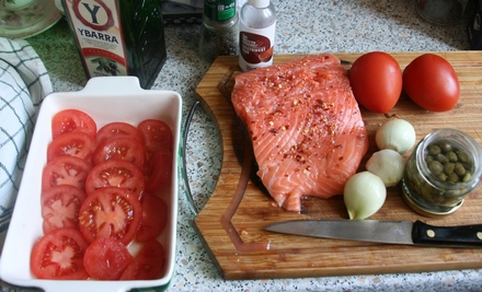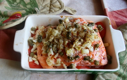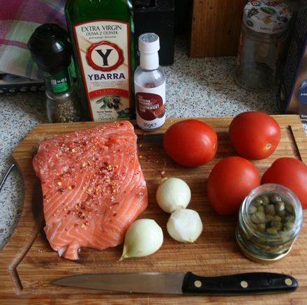 Na pomidorach ułożyć filet ryby. Cebulkę pokroić w plasterki, przesiekać razem z kaparami (po odcedzeniu z zalewy). Ułożyć na rybie, skropić oliwą, posypać pieprzem z młynka.