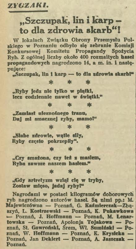 Ryb wciąż jemy za mało. Przed wojną też tak było. Organizowano więc różne akcje, aby propagować ich spożywanie. Oto plon jednej z nich. Informację o konkursie i nagrodach na najzręczniejsze hasła zamieścił „Ilustrowany Kuryer Codzienny” w roku 1938. Konkurs był przeprowadzony w Poznaniu. Może wśród nagrodzonych ktoś odnajdzie nazwisko swojego przodka?