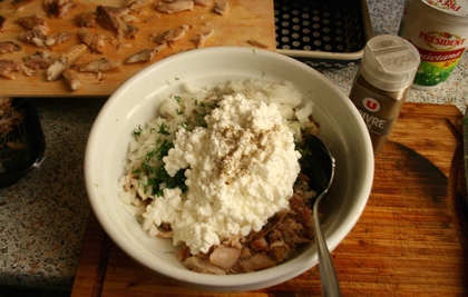 Tyle oryginał. Teraz „Awanturka” podług mojej bajki. Składniki w zasadzie się nie zmieniają. Ale ja nie przepadam za ucieraniem składników na gładką pastę. Dlatego do tej sałatki – bo tak ją podaję – biorę grudkowaty serek wiejski. A rybę dzielę na cząstki, aby się czuło, że to właśnie ryba.
