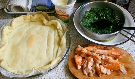 Przygotować szpinak (na patelni rozgrzać masło, wrzucić szpinak, rozmrażać mieszając, dodać zmiażdżony lub posiekany czosnek, sól, pieprz i pół łyżeczki cukru). Przestudzić. Brzuszki łososia oddzielić od skóry, usunąć ości, mięso rozdzielić na cząstki. Ciastem wyłożyć formę na tartę. Podpiec przez 10 minut w 200 st. C. Zmieszać śmietanę z jajkami, posolić, popieprzyć. Wylać na podpieczone ciasto, zapiec przez kolejne 8–10 minut.