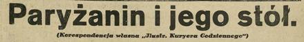 „Ilustrowany Kuryer Codzienny”, największa przedwojenna gazeta polska, zamieszczał nie tylko analizy i poważne analizy publicystyczne, nie tylko reportaże, newsy gospodarcze, ale także teksty mniej ważne. Takie do czytania przez przeciętnego czytelnika, artykuliki dla każdego. Redagowane w nowoczesnym wówczas, amerykańskim, stylu. Pewnie dlatego gazeta była tak popularna! W roku 1933, w czasie tzw. ogórków wakacyjnych, IKaC zmieścił barwny reportażyk-opis codziennej restauracyjnej kuchni francuskiej, a właściwie paryskiej. Czy wiele się od tego czasu zmieniło? Pewnie tak. Choćby za sprawą tego, że Paryż stał się miastem tak wielokulturowym. Spójrzmy więc, jak było. Jak żywił się przeciętny paryżanin. Bądź co bądź, Francja wówczas miała kuchnię numer jeden w Europie i właściwie na świecie. To także się zmieniło, choć ranga tej gastronomii nadal pozostaje wysoka. Tekścik opisany jako „korespondencja własna” nie był podpisany; zgodnie z ówczesnym obyczajem niewielu dziennikarzy zasługiwało na opatrzenie artykułu nazwiskiem. Pisownia ówczesna. Także pogrubienia oryginalne. IKC słynął z takiego udobitniania tekstu grubym drukiem lub kursywą, nieraz fantazyjnie rzucaną, co obśmiewał Antoni Słonimski.