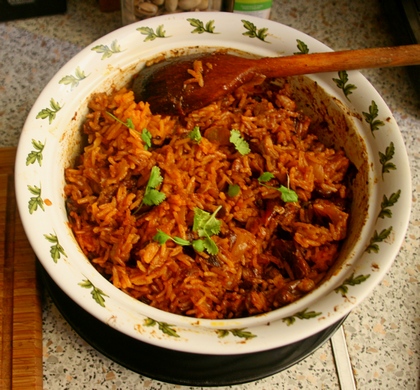 W jednym naczyniu do zapiekania miękki, ale sypki ryż połączyć z miękkim mięsem. Kto chce, może dołożyć przecier pomidorowy. Doprawić do smaku. Przemieszać ze świeżym masłem (2 łyżki). Wstawić do piekarnika. Wypiekać z pół godziny. W razie gdyby potrawa była za sucha, można przed wypieczeniem dolać jeszcze trochę bulionu. Podając posypać świeżymi ziołami.