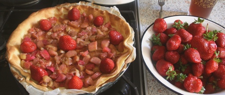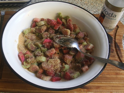 Ciastem wyłożyć okrągłą formę, zapiec je przez 15 minut w 200 st. C. W tym czasie króciutko poddusić rabarbar razem z sokiem, który się utworzył z cukru i wody różanej. Jeżeli soku za mało, podlać wodą różaną lub wodą. (Dla dorosłych można skropić rumem lub brandy).
