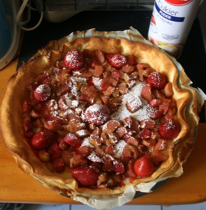 Podpieczone ciasto obłożyć przestudzonym rabarbarem i truskawkami. Wstawić do piekarnika na kolejny kwadrans. Tuż przed podaniem posypać cukrem pudrem z młynka lub przesianym przez drobne sitko.