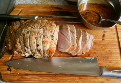 Jeżeli mięso było trzymane w lodówce, wyjąć pół godziny przed pieczeniem. Piekarnik nagrzać do 220 st. C. Wstawić pieczeń na 20 minut, w połowie odwrócić. Zmniejszyć temperaturę do 165 st. C, obsypać ziarnami ziela angielskiego i pieprzu, podlać szklanką wody, piec godzinę. Jeżeli naczynie się przykryje, nie trzeba mięsa podlewać sosem z pieczenia. Mięso jest upieczone, gdy termometr pokaże 70 st. (dobrze wypieczone – 75 st. C). Odstawić na kwadrans przed pokrojeniem. Sos zlać, mocno podgrzać doprawiwszy do smaku musztardą, solą, pieprzem; można też rozprowadzić łyżkę śmietany, lecz nie jest to konieczne.