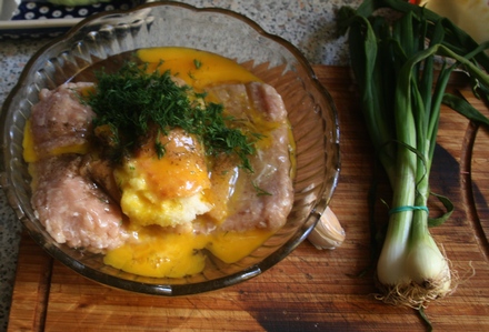 Natkę, koperek, zioła i dymkę drobno przesiekać. Mięso mielone starannie wymieszać z namoczoną i odciśniętą bułką oraz z jajkami.