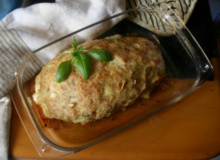 Rękami zmoczonymi w zimnej wodzie uformować bochenek, wygładzić go z wierzchu. Oprószyć tartą bułka, skropić oliwę. Piec w piekarniku nagrzanym, do 180 st. ok. pół godziny.