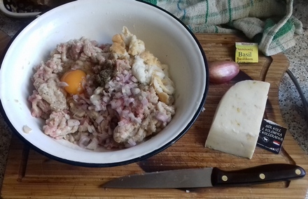 Bułkę namoczyć, potem, wycisnąć i dobrze zemleć. Mięso wyrobić z łyżką zimnej wody oraz bułką. Dodać pokrojone szalotki w drobną kostkę, suszone zioła, sól, pieprz i jedno jajko. Starannie wszystko połączyć w jednolitą masę. Dorzucić kostki sera, wymieszać, aby się równomiernie rozłożyły.
