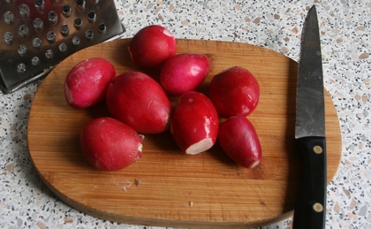 Pokaże więc taką potrawę, do której zużyłam pęczek apetycznej rzodkiewki. Zwykle dodaje się ja do kanapek i sałatek, czasem krojoną w plasterki, czasem siekaną czy nawet ucieraną. Jakoś w zapomnienie poszła rzodkiewka gotowana albo duszona, podawana jako jarzyna. Czasem taka podaję, ale rzadko. Obieram ją wtedy z różowej skórki i zyskuje wygląd białych kulek. Teraz postąpiłam inaczej. Ale zanim opiszę, co wymyśliłam, przytoczę garść ciekawostek rzodkiewkowych. Jak to ja, znalazłam je w starych gazetach.