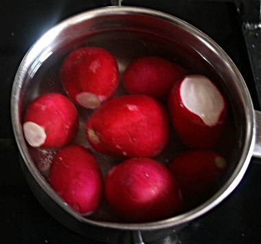 Rzodkiewki oczyścić z ogonków, wrzucić do wrzącej osolonej wody, obgotować 5 minut, odcedzić.