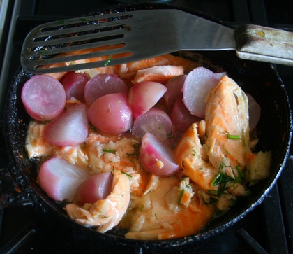 Łososia posolić, popieprzyć. Masło rozgrzać, filet obsmażyć. Dodać rzodkiewki całe lub przekrojone na pół, zmniejszyć temperaturę, poddusić. Posypać posiekanym koperkiem, podawać na gorąco.