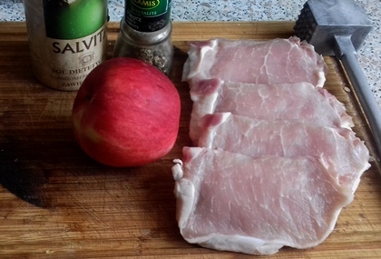Proponuję połączenie schabowych z jabłkami. Można do kotletów podać po prostu uduszone lub upieczone jabłka, ale przyszło mi do głowy usmażyć je w połączeniu z kotletami. Ładnie to wygląda i smakuje dobrze.