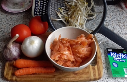Jak i w pierwszym z blogowego cyklu takich posiłków, będzie to danie z patelni. Mocnym punktem jego smaku uczyniłam wędzonego łososia. Taniego, bo sprzedawanego w postaci kawałków sałatkowych. Nie jest to łosoś najwyższej jakości, takiego smaku i takiej wartości. Ale podajemy go wśród warzyw, no i nie jadamy codziennie. Nie martwmy się więc, że to ryba hodowlana, a nie z pełnego morza czy oceanu.