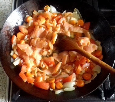 Gdy marchewka zacznie miękną, włożyć półplasterki pomidorów i łososia. Mieszając zagrzać.