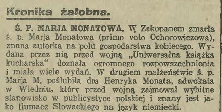 Nie jest łatwo, ale coś się udaje. Na początek doniosę, że potwierdziłam datę jej śmierci. To bez wątpienia już rok 1925. Zmarła w Zakopanem, gdzie razem z mężem Henrykiem Monatem pomieszkiwali. Dokładny dzień i przyczynę odejścia najwcześniej podała gazeta zakopiańska: