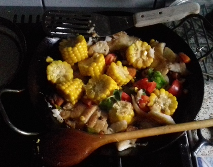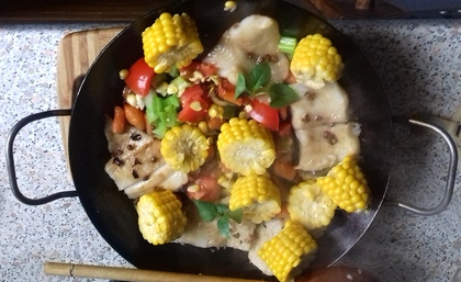 Gdy filety będą obsmażone, do warzyw dołożyć ćwiartki pomidorów i posiekany szczypior. Po minucie–dwóch na wierzchu rozłożyć kukurydzę. Zagrzać. Podać po posypaniu świeżą bazylią.