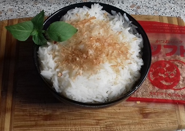 Do dania z patelni można podać pieczywo (bagietkę nadkroić tak, aby nie była całkiem rozdzielona na kromki, wstawić na kilka minut do piekarnika) lub ryż. Jaśminowy ryż gotujemy zgodnie z czasem podanym na opakowaniu, mieszamy widelcem pod wyłożeniu do miski. Taki ryż podałam po posypaniu suszonymi płatkami tuńczyka, które dostałam od Przyjaciół z dalekiego Oregonu (Irino, Bogusiu – pięknie dziękuję). To przyprawa (czy składnik dania?) przywieziona z Japonii. Gdy płatkami posypiemy gorący ryż, śmiesznie się kurczą i podskakują. Dodaje się je także do warzyw lub zup. Przyprawę widać na zdjęciu.