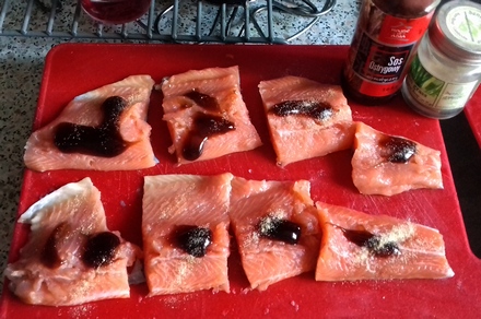 Filety oczyścić z pozostałych ości. Pokroić na kawałki razem ze skórą. Na każdy od strony bez skóry nałożyć sos ostrygowy, posypać trawką cytrynową.