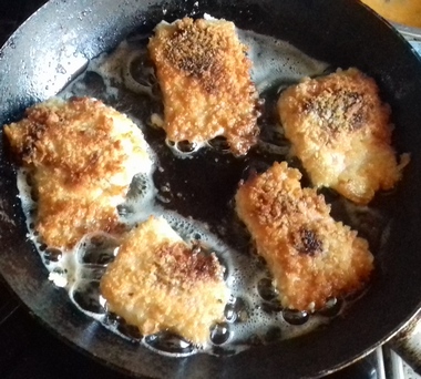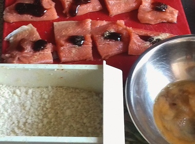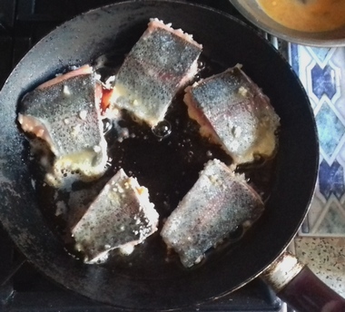 Na patelni rozgrzać masło. Każdy kawałek zanurzać w jajku, a od wierzchu posmarowanego sosem ostrygowym panierować w bułce tartej, dociskając ją (filet ze skórą pozostaje tylko obtoczony w jajku). Smażyć zaczynając od strony z bułką.