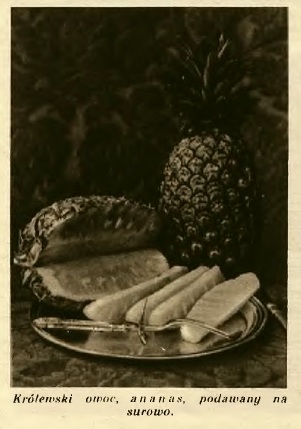 W PRL-u ananasy bywały tylko puszkowane i to z rzadka. Dziś mamy wybór. Od puszkowanych, zgrabnie pokrojonych w plastry lub kawałki, po świeże. Jak podać te świeże? Pokazuje obrazek także z IKC-a z roku 1936 (notka też z tego roku).