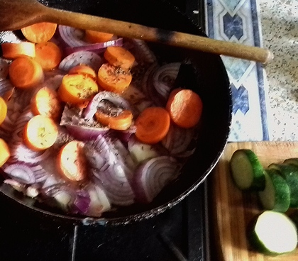 Mięso pokroić w kostkę, warzywa w plasterki. Rozgrzać tłuszcz, wrzucić plasterki marchwi i cebuli, posolić je. Smażyć na średnim ogniu mieszając, aby tylko straciły surowość.